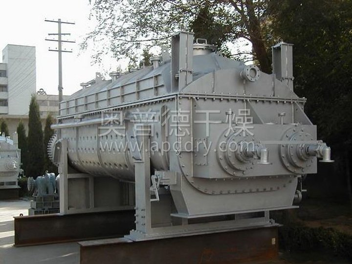 空心軸上密集排列著楔型中空槳葉,熱介質經空心軸流經槳葉。單位有效容積內傳熱面積很大,熱介質溫度從-40℃到320℃,可以是水蒸汽,也可以是液體型:如熱水、導熱油等。間接傳導加熱,沒有攜帶空氣帶走熱量,熱量均用來加熱物料。熱量損失僅為通過器體保溫層向環境的散熱。楔型槳葉傳熱面具有自清潔功能。物料顆粒與楔型面的相對運動產生洗刷作用,能夠洗刷掉楔型面上附著物料,使運轉中一直保持著清潔的傳熱面。槳葉干燥機的殼體為Ω型,殼體內一般安排二到四根空心攪拌軸。殼體有密封端蓋與上蓋,防止物料粉塵外泄而充分發揮作用。
